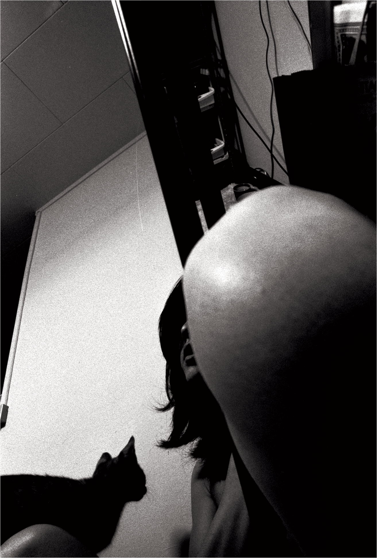 トリッキーな自分のポートレートを撮りたくなって、飼い猫にも登場してもらい鏡を利用して空間を歪ませ、絵画的に構成しています。