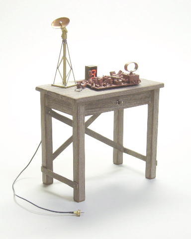 屋根裏部屋をテーマに行なった個展での作品。小さな机の上の電気部品は実際の音が鳴るラジオ。巾15センチ程の小さな作品です。