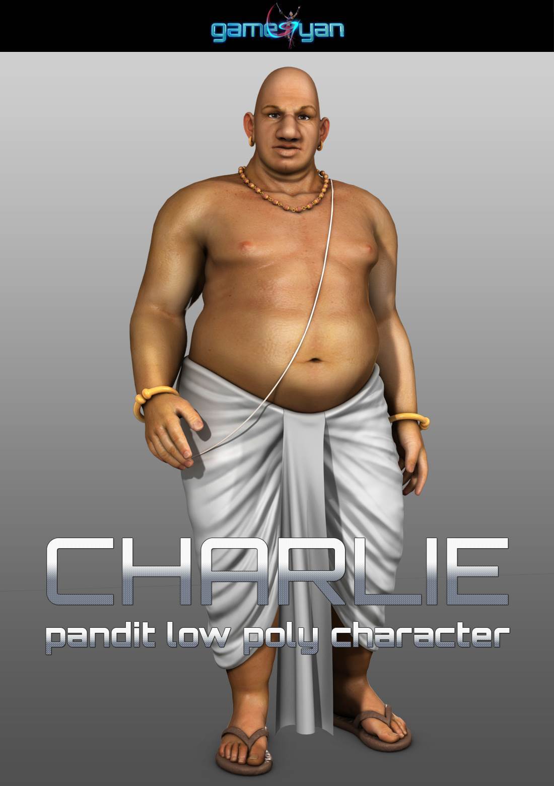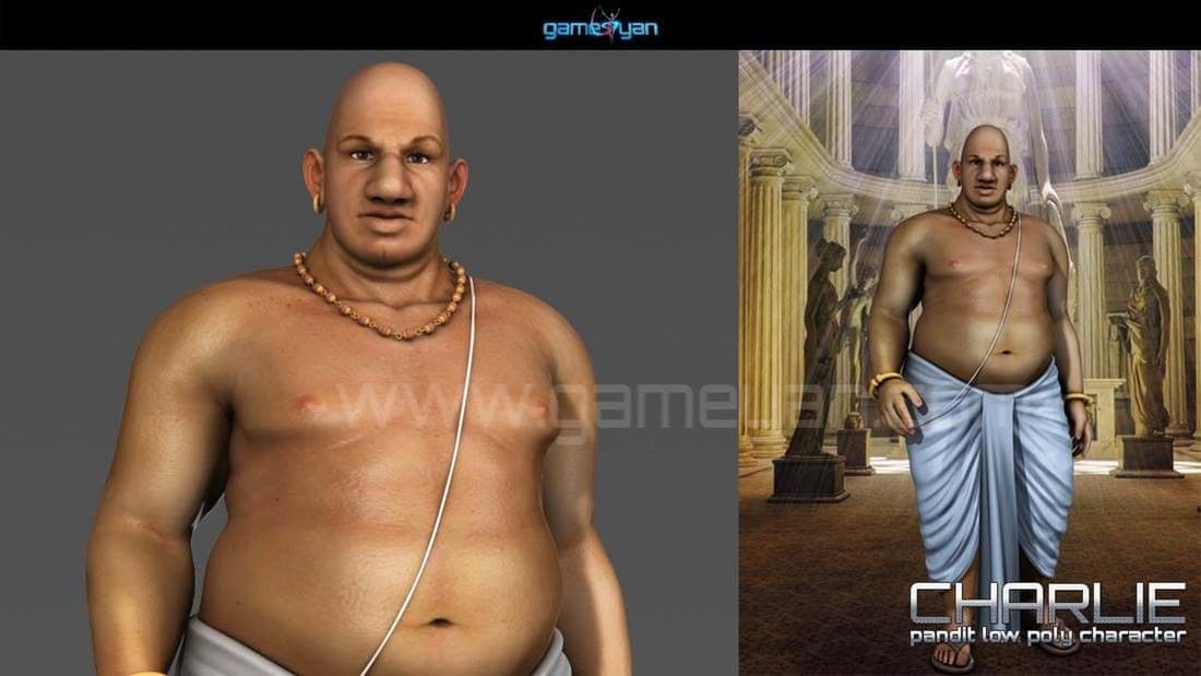Semi Cartoon Indian Human 3D Pandit Character with Dhoti (Cloth), semi-realistic texture with supported texture maps, Diffuse, specular, SSS map, SSS Back scatter weight map, Bump, Normal map.