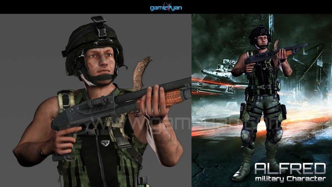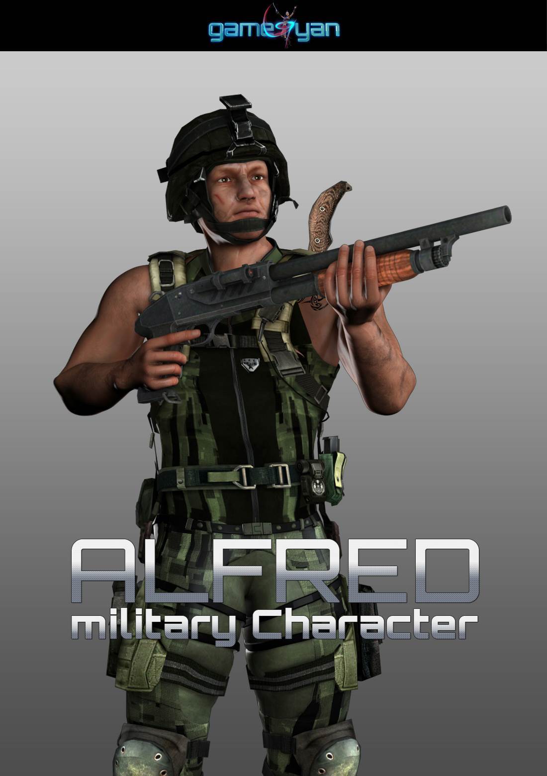 Low poly soldier 3d game character posed model with game assets like gun, knife, armor, pistol etc. this 3d soldier is having realistic texture.