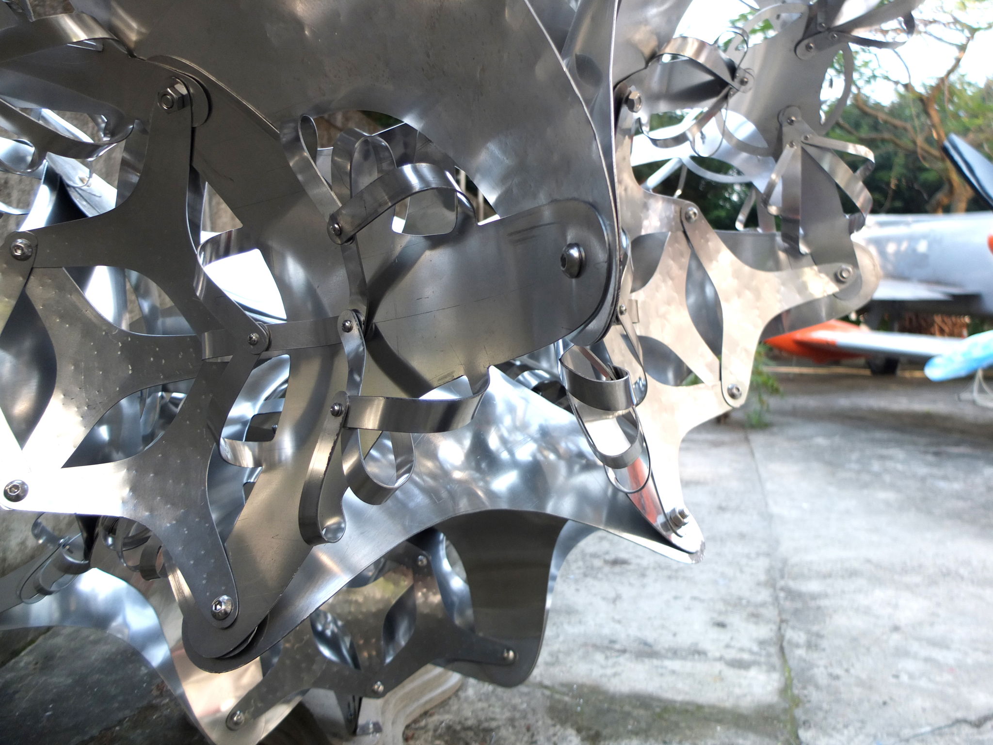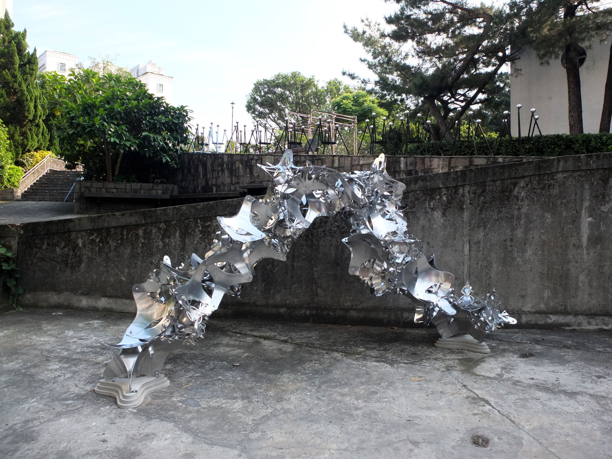 The project designed from the materiality of textiles of metals and aggregation of octahedrons, constructed entirely by 1.5mm aluminum sheets. This design takes the advantages of the self-weight and materiality of the metal sheets for the structure, considered of budget, time, manpower and equipment, the pavilion was 3m*4.5m*2.2m in the final and constructed by units. The form was generated through Rhino and Grasshopper algorithm, fabricated by plasma cut and shaped the curvature by stamp for the units.