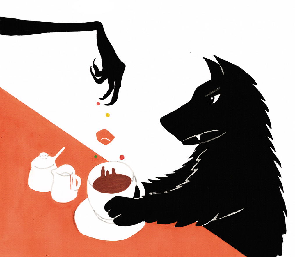落ち込むオオカミのカップにチョコレートを入れてくれる悪魔。じつは心優しい悪魔のようです。