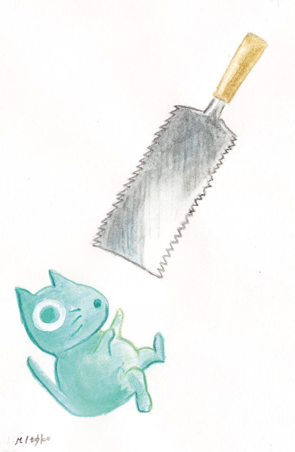 この絵のために「人」ではなく「動物」にしたのに、描き直すことになって、この絵はボツってしまいました。やはり「刃物を向ける」なんて道徳上よくないと判断されたのでしょうか。これがヒトだとまずいだろうと思ったので猫にしてみたのに...なんて動物愛護の団体に怒られるかもしれませんね。