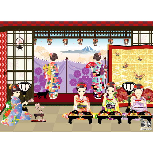 日本家屋の縁側、障子、襖、提灯、屏風、着物、桃割れの日本髪