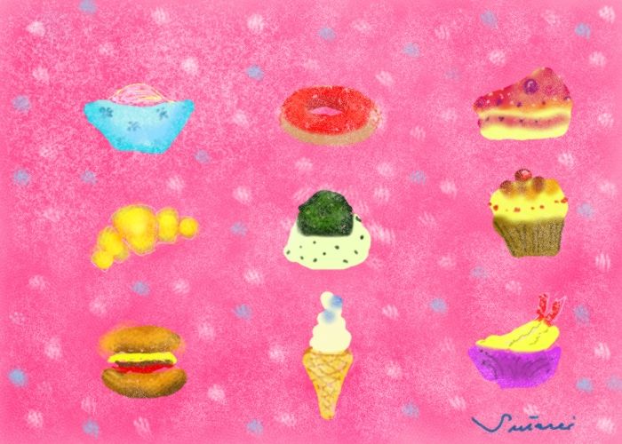 拉麺、ご飯、天ぷら、寿司、ケーキ、アイスクリーム、ハンバーガー、欲しいものを食べる