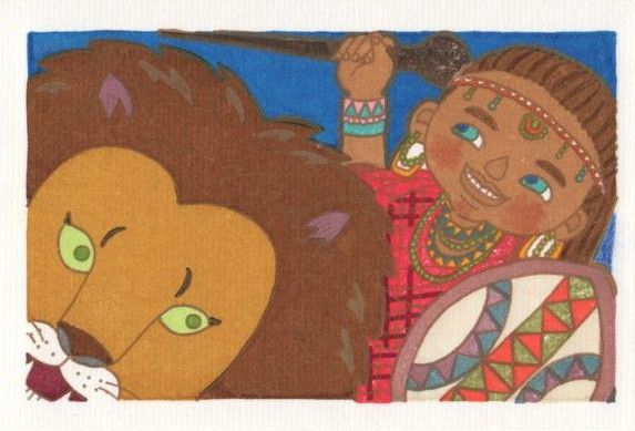 プリントゴッコ5版で作成。アフリカに来てしまいました。ライオンに乗っているマサイ人を描きたかったのですが、どう見てもライオンを襲っているマサイ人? 困りました。