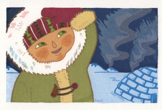 プリントゴッコ5版で作成。実際にカナダのイエローナイフでオーロラを見ました。