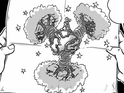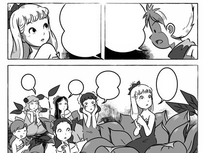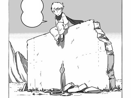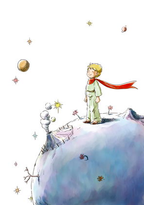 巻末の原作者解説ページ用に描かれたイラスト。作者(サン=テグジュペリ)と王子さまと花とヒツジ。