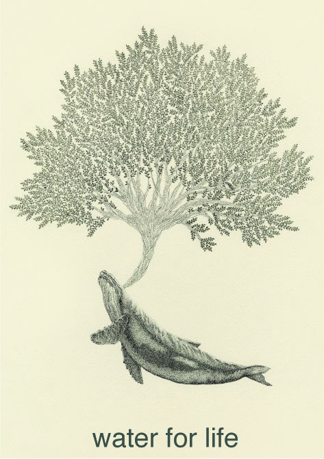 「水」がなければ, 生物も, 植物も育つ事はない。水中に生きるクジラと, 水によって青々と茂る樹をモチーフに,「水」が私たちに与えてくれる命の美しさを点描で繊細に表現した。2008年 B1 728×1030mmを想定