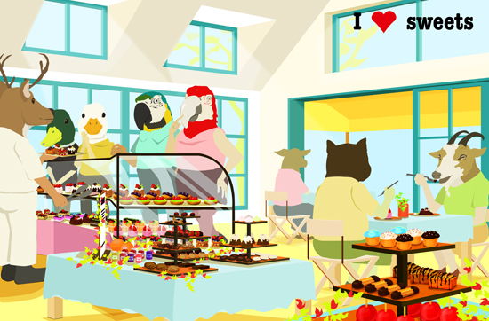 まったく迷っちゃうわ。どのケーキにしようかしら?ハニー、君はあの素敵なケーキにしたらどうだい?そうねぇ。でもあたしはあっち、うーん、こっち、あー全部食べたいわ。