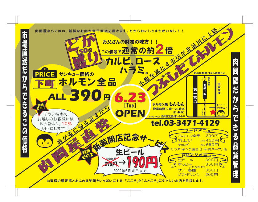 リニューアルオープンする北品川のホルモン焼もんもんという、ホルモン・焼肉屋の折込チラシです。