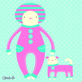 オリジナルキャラ「つなぎさん&つなぎ犬」です。お気に入りのつなぎはデニム素材のため着るのに時間がかかるのが難点。散歩をしながら空想にふけるのが得意。