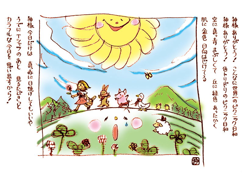 空に真っ青 まぶしくて 丘に緑色 あったかく 肌に金色 日向はじけてる