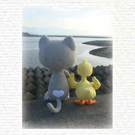 ねことアヒルのぬいぐるみの写真です。