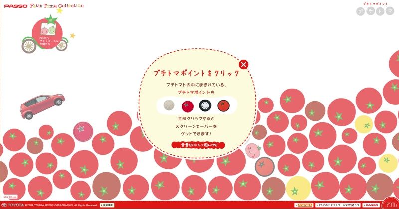 PASSO特別仕様車「パッソプチトマコレクション」サイト。プチトマトがたくさん、プチプチつぶしたり、弾んだプチトマトを動かしたり…。効果音の制作をしました。