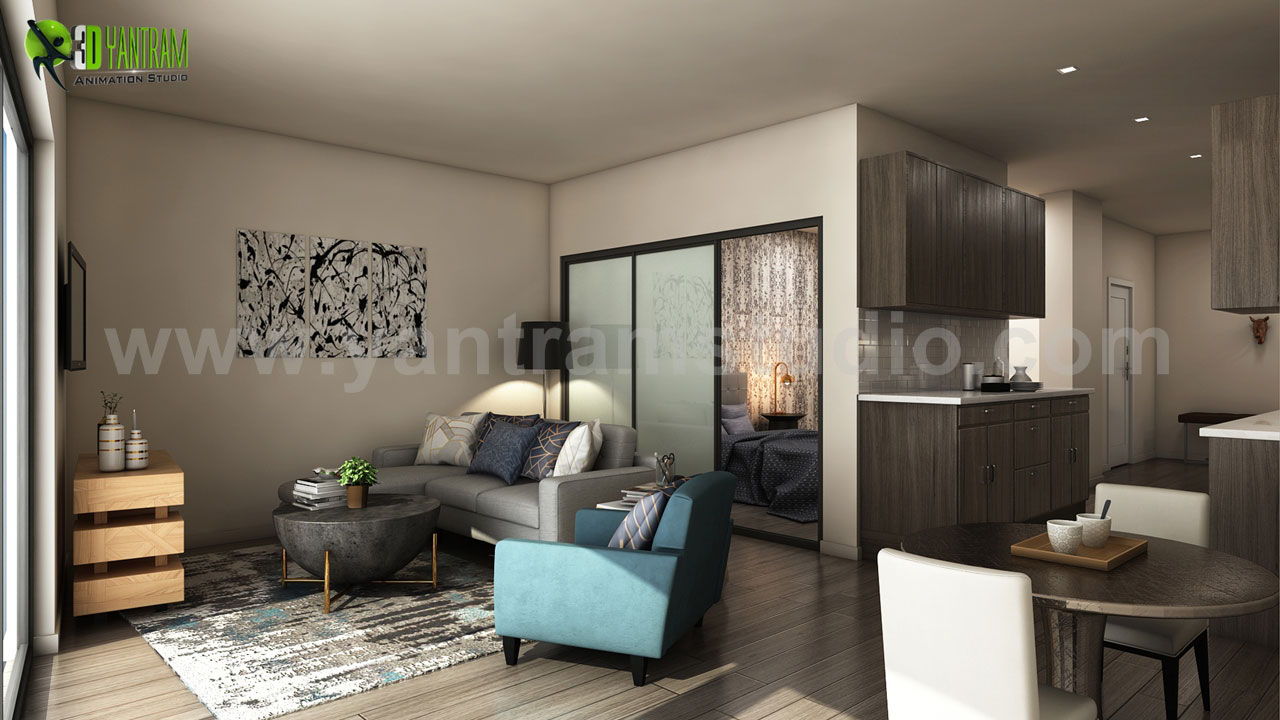 Latest Apartment with 3D Interior Modeling, Luxuries Combo of Living room and kitchen with Wooden Floor & Furniture Ideas by Yantram Interior Design for Home, Miami - USA