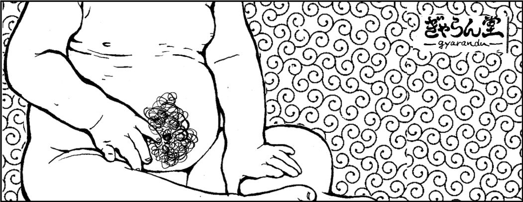 腹毛と陰毛の間の毛を「ぎゃらんどぅ」と呼ぶことからこのイラストにしました。店名もそこから取っています。