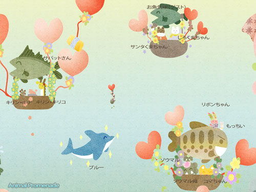お魚気球に、「サンタくまちゃん」と、「しろくまちゃん」、お魚気球になった「サバットさん」には「キリン・キリコ」&「キリン・キナ」、お魚気球になった「ヤマさん」には「ゾウマル」と「ゾウマル母」、「コマちゃん」、「もっちい」、「りぼんちゃん」が乗っています。
