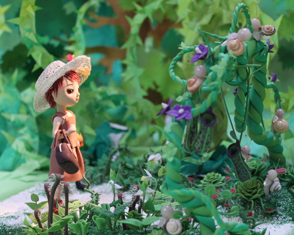 相棒のオカメダックと旅をしている女の子、靴が片方壊れてしまい足をケガして困っていたがやっと「癒しの森」と呼ばれている不思議な癒しの力に満ちた場所にたどり着いた場面をイメージして制作しました。