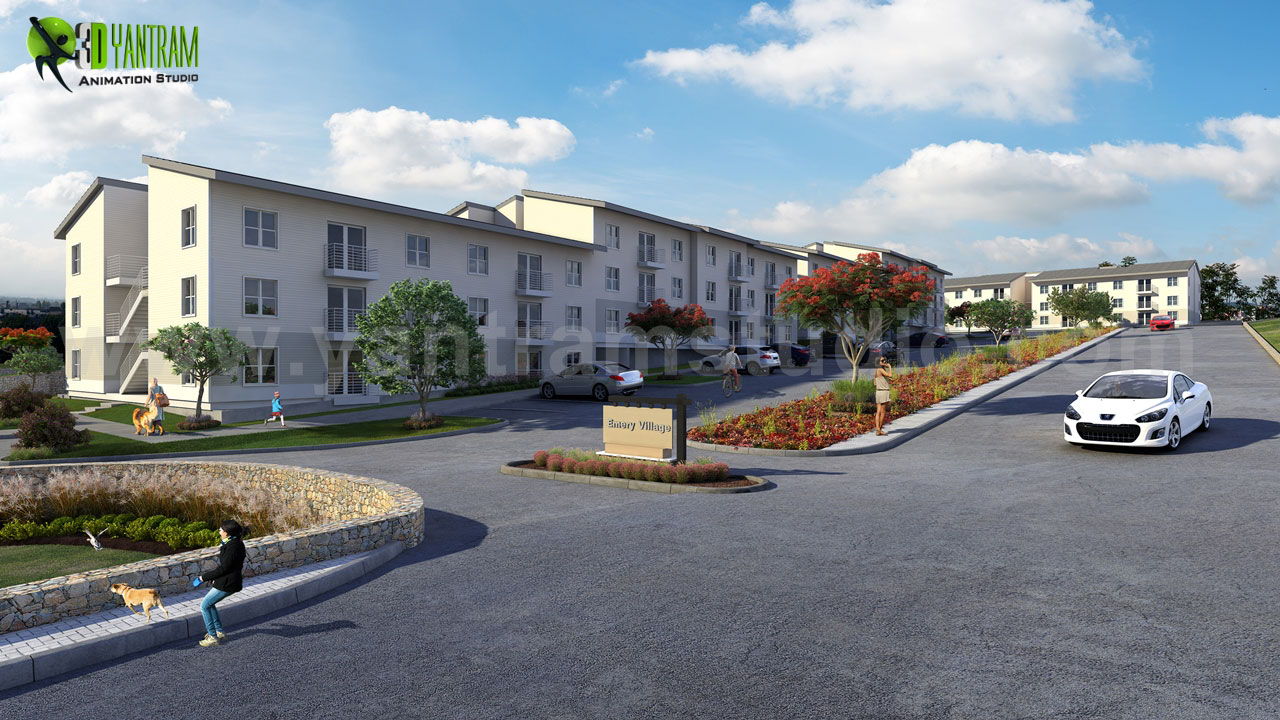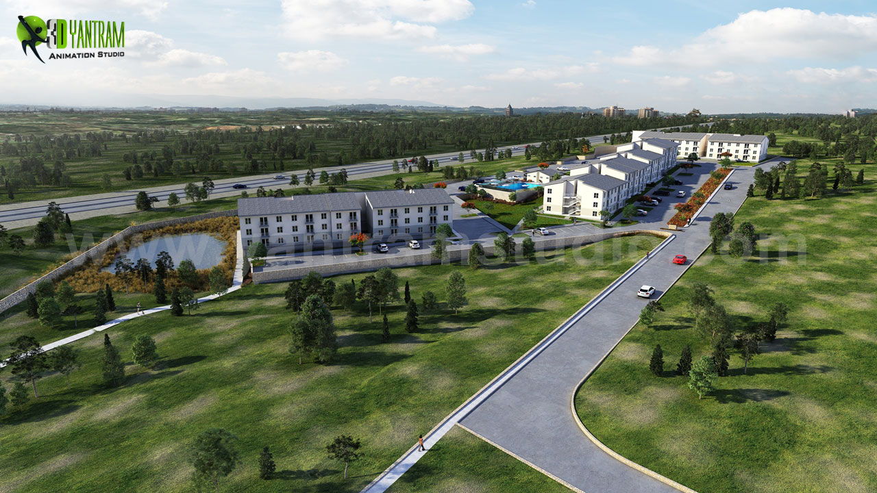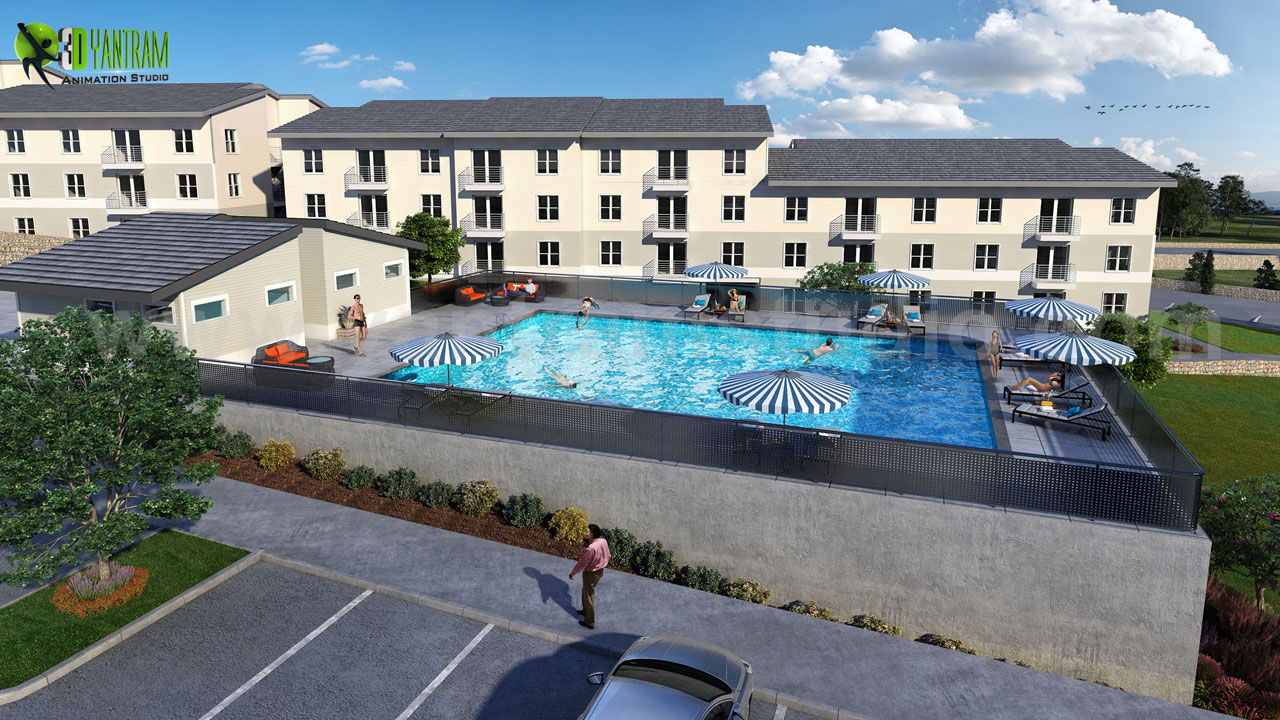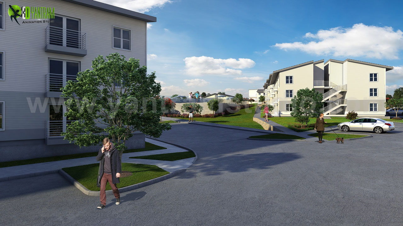 3Dエクステリアウォークスルーコミュニティアパートメント360ウォークスルーエクステリアロードサイドビュー(ランニングとパーキングエリアあり)、3D建築アニメーションオープンロードサイドビュー駐車場と緑地、3D外観レンタルプールビュー(座席と駐車場あり、3Dウォークスルー木製家具とバルコニー付きのリビングルーム 視覚化、建築ウォークスルーインテリアキッチンサービス、3Dエクステリアウォークスルー、遊ぶこと、道路を囲むエリア - Yantram 3D外装デザイン会社、ミラノ - イタリア