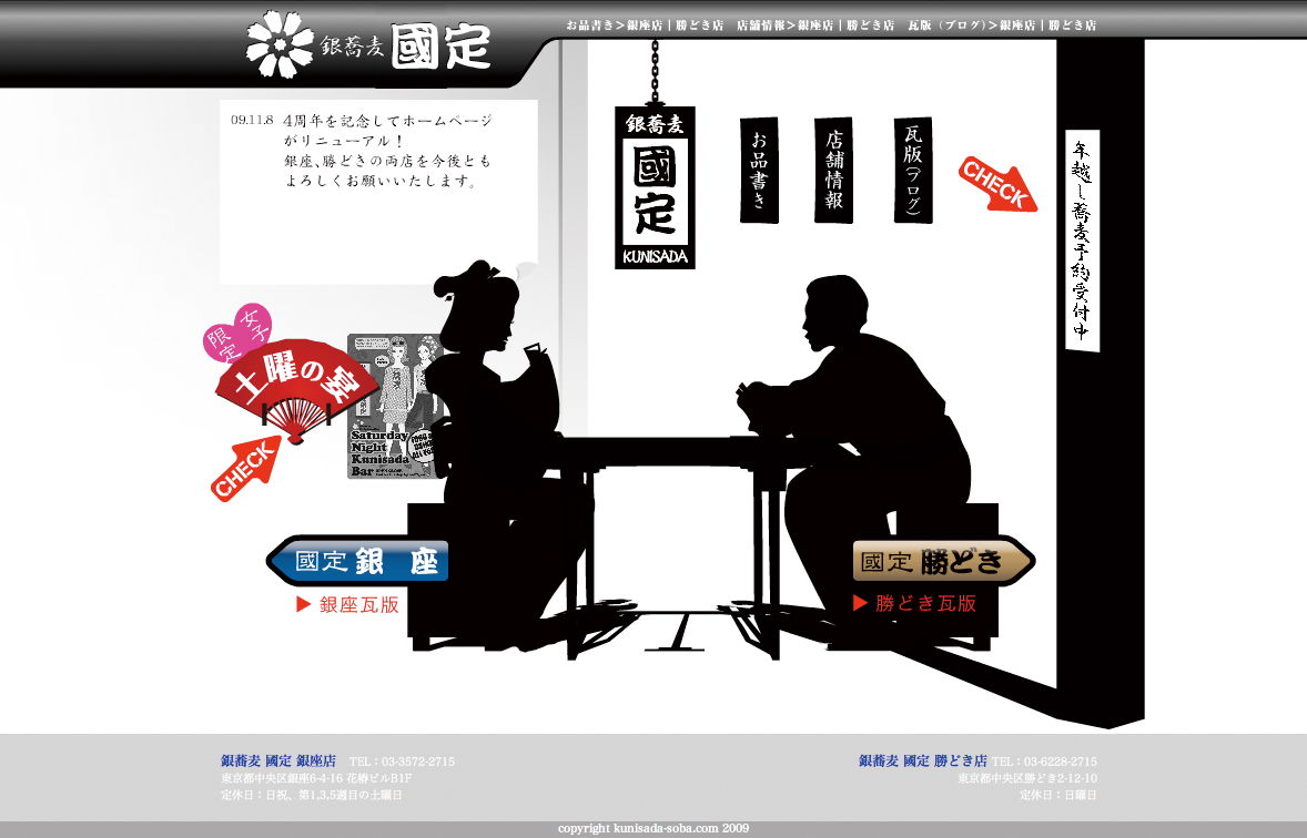 平面の組み合わせで立体感を出すアニメーションに挑戦した作品。デザインコンセプトは「恋するおソバ屋さん」で初めての逢い引きをしている男女という設定。國定さんの持っているお蕎麦への愛と、女性ならではの感性を表現してみた。全体のカラーは澄んでいてどこか凜とした冷ややかイメージが蕎麦屋には合うのではないかと思いこのようなものになったのだが、良くマッチしていると思います。