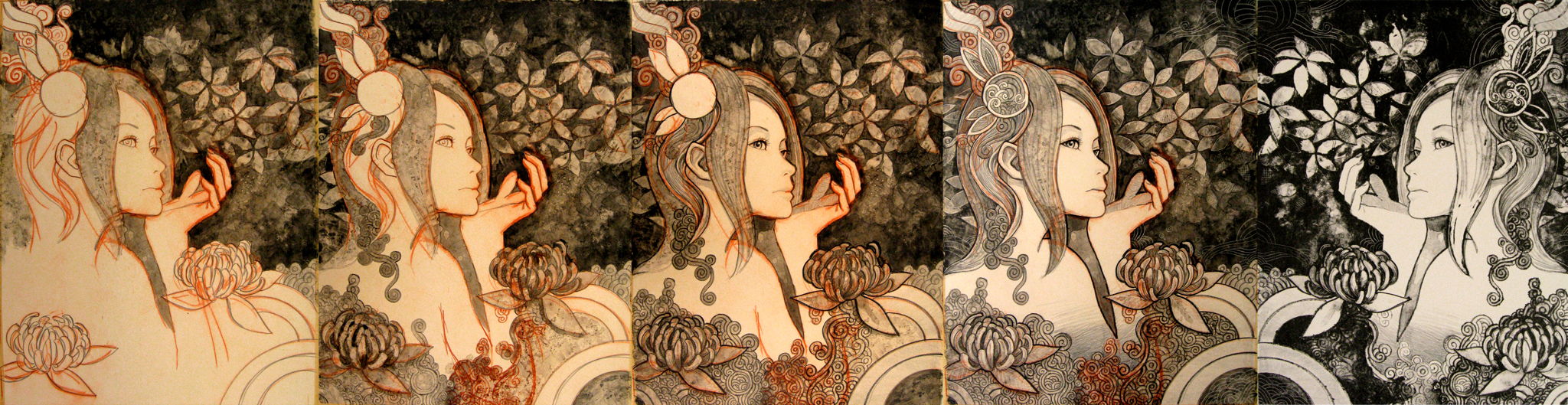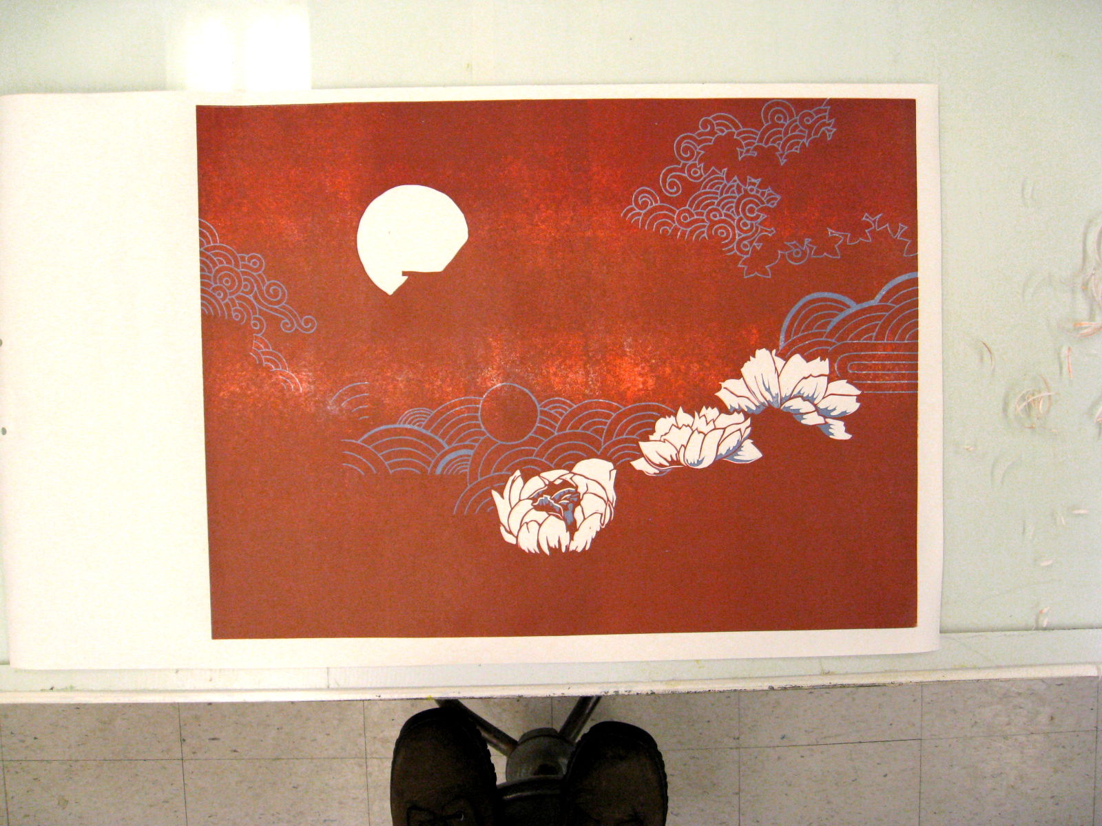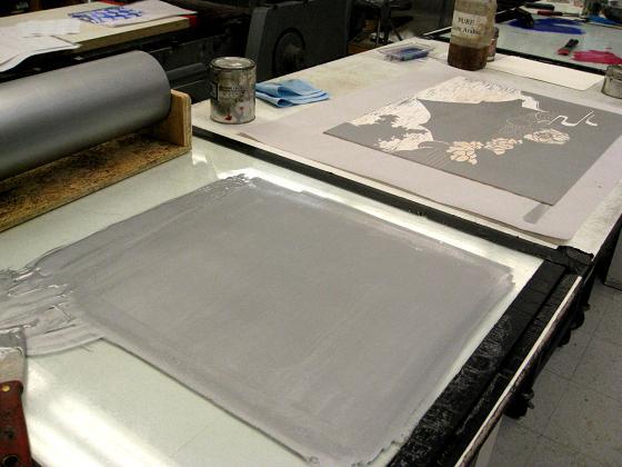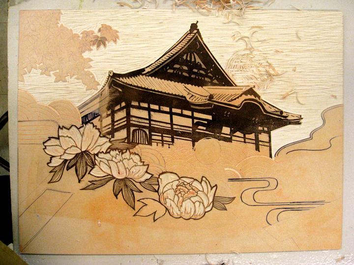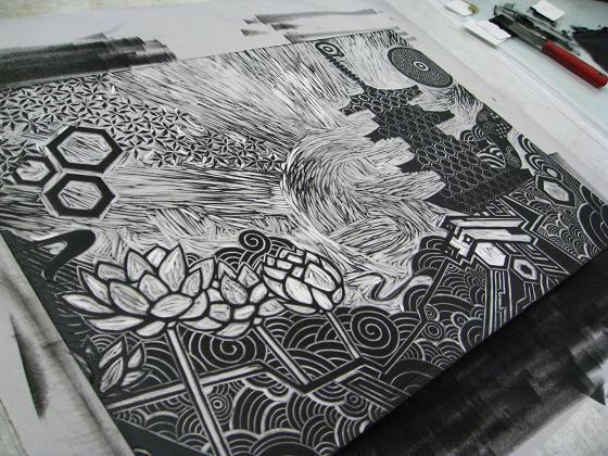 複数のレイヤーを一つの木版(これはプラスチック)から掘り出す技法、一つ目のレイヤーを彫って刷り、また次のレイヤーを彫って刷っていきます。