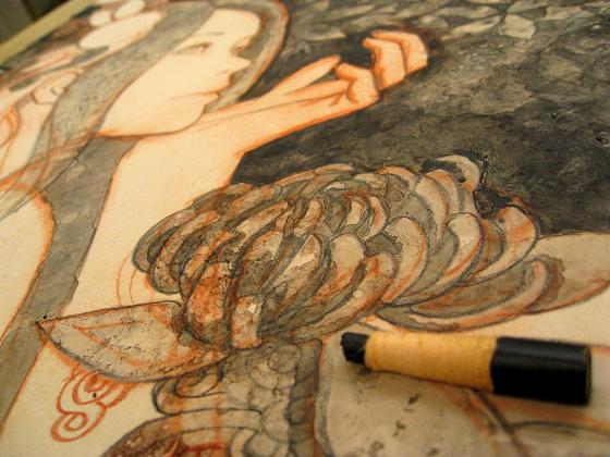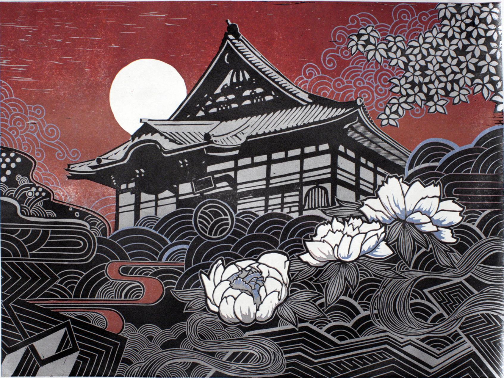 子供の頃に父が描いた水彩画が綺麗で、それもお寺と牡丹の組み合わせだったのを何となく覚えていたのを自分なりにアレンジしてみました。
