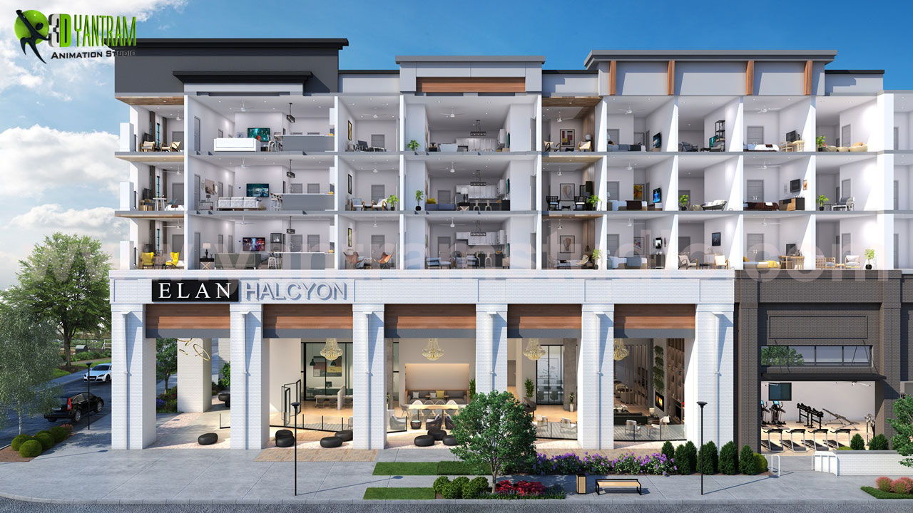 3Dバーチャルカットセクションの外観、各ユニットのインテリアと家具の配置を含むアパートメントの外観。 住環境と自然の風景が現実感をよりリアルにします - Yantram Architectural Studio、フロリダ州のアイデア