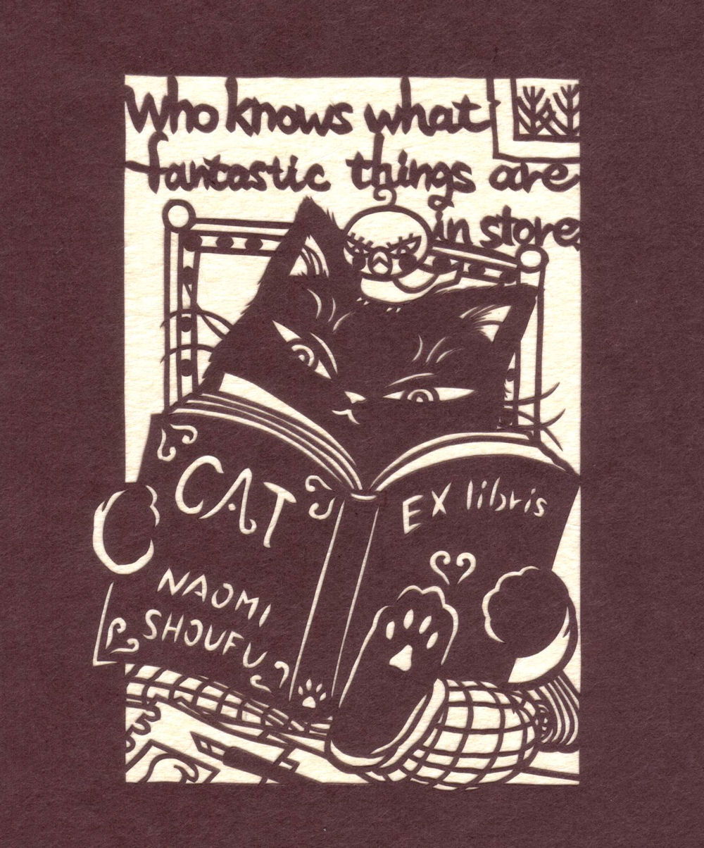 蔵書票展に出品した作品。自画像と当時飼っていた鳥、机の上には自分の職業となるヒントが転がっています。