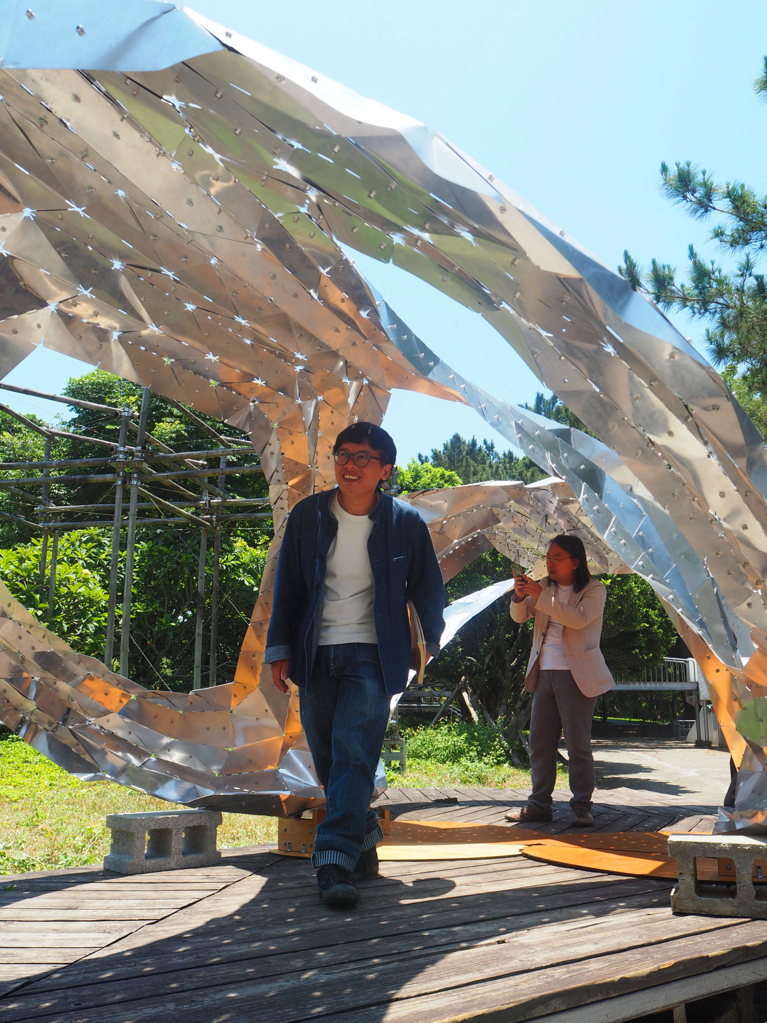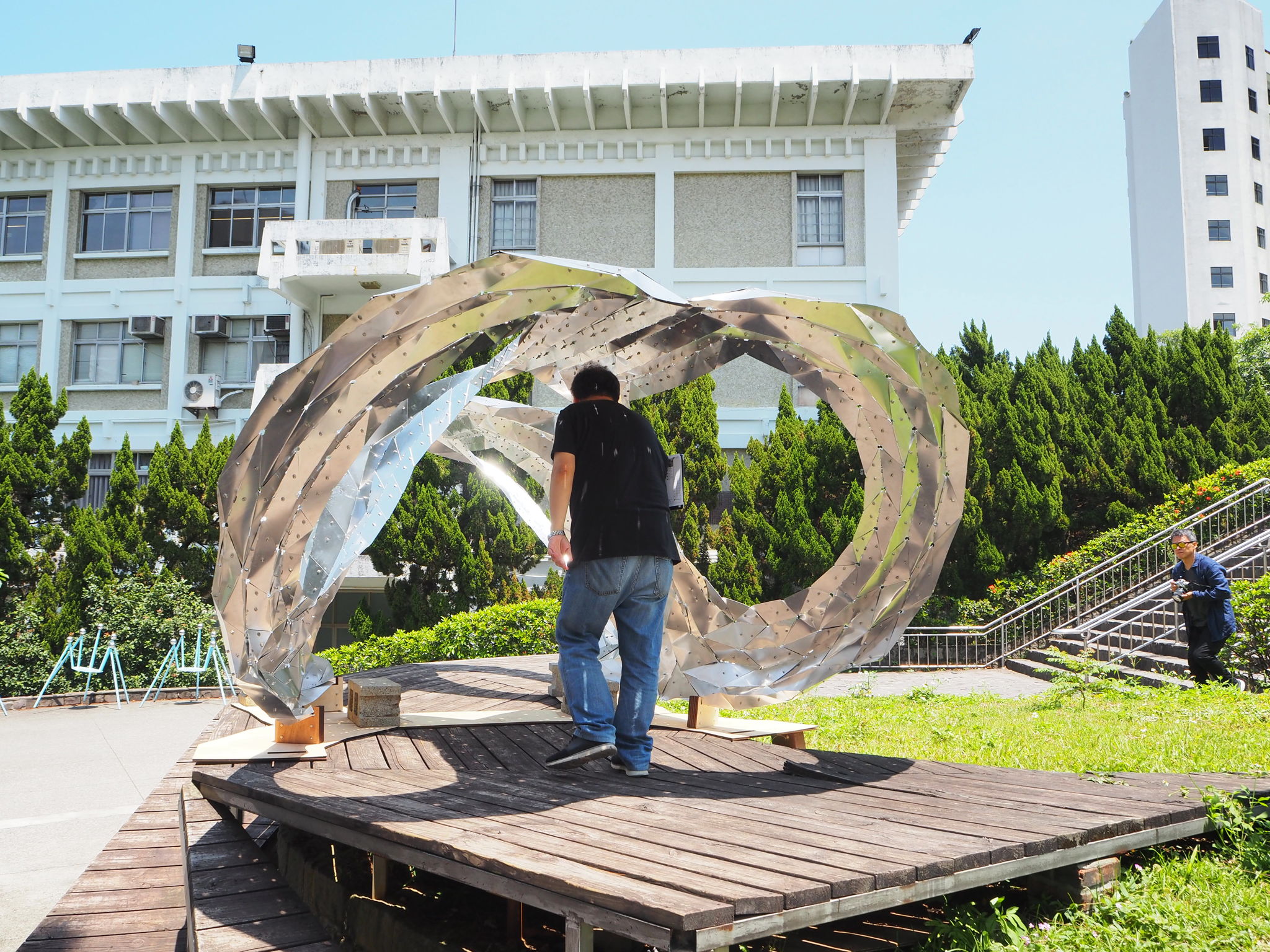 This pavilion is located in front of Dept. of Architecture, Tamkang University, and the purpose of the pavilion is a temporary resting space and landmark. By means of parametric modeling, form-finding and structural analysis, the preliminary design prototype with folded metal as material was generated based on the conditions of the site. The entire pavilion consists of four large oval pieces of metal, each oval consisting of 25 consecutive three-fold metal sheets. The manufacture of continuous metal folding is facilitated by the help of the robotic arm. This experimental pavilion is looking forward to demonstrating the feasibility of combining digital and robotic fabrication.