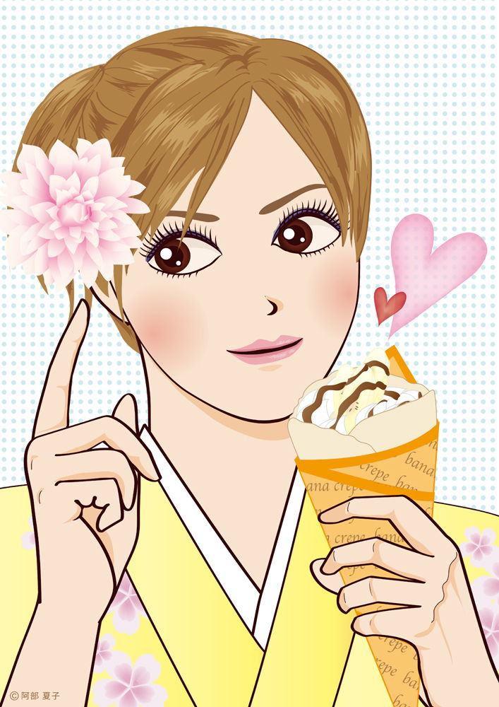 和風と洋風のコラボレーションをコンセプトとして描いた作品です。ギャル風のメイクだけど、和服。和服だけど、クレープを食べてる。一見ちぐはぐだけど、なんかかわいい、というのを目指して描きました。