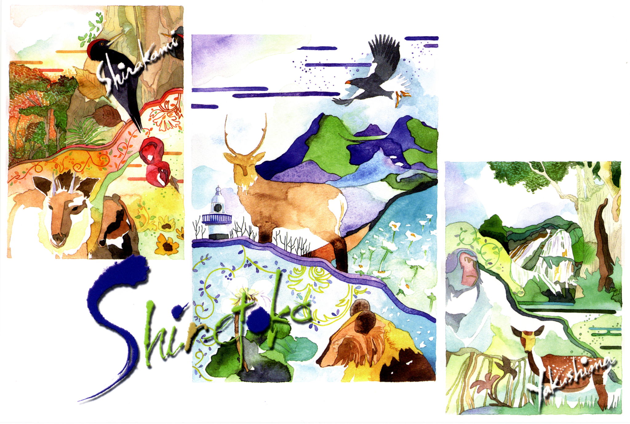 世界遺産の知床・白神山地・屋久島に関する環境省報告書で描き上げた作品を、印刷サンプルとしてポストカードにアレンジしたものです。