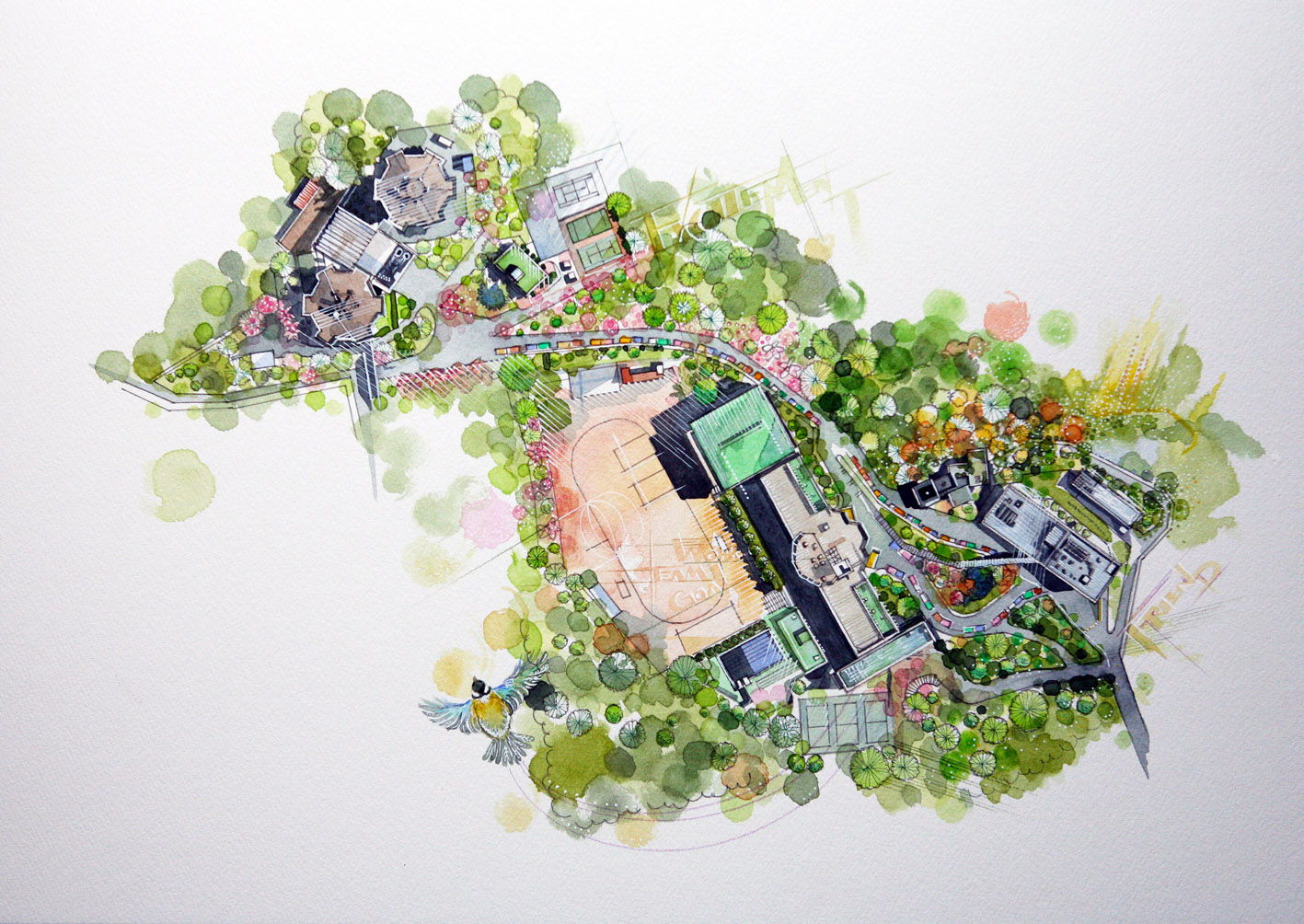 横浜山手学院学案の表紙です。緑豊かな環境と広大な広大な敷地を、鳥瞰図方式で表現しました。