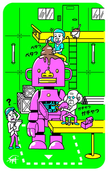博士と助手がロボット作ってます。 ちなみに、この博士と助手は卓球はできません。 色バッキバキ。 蛍光色バッキバキ。