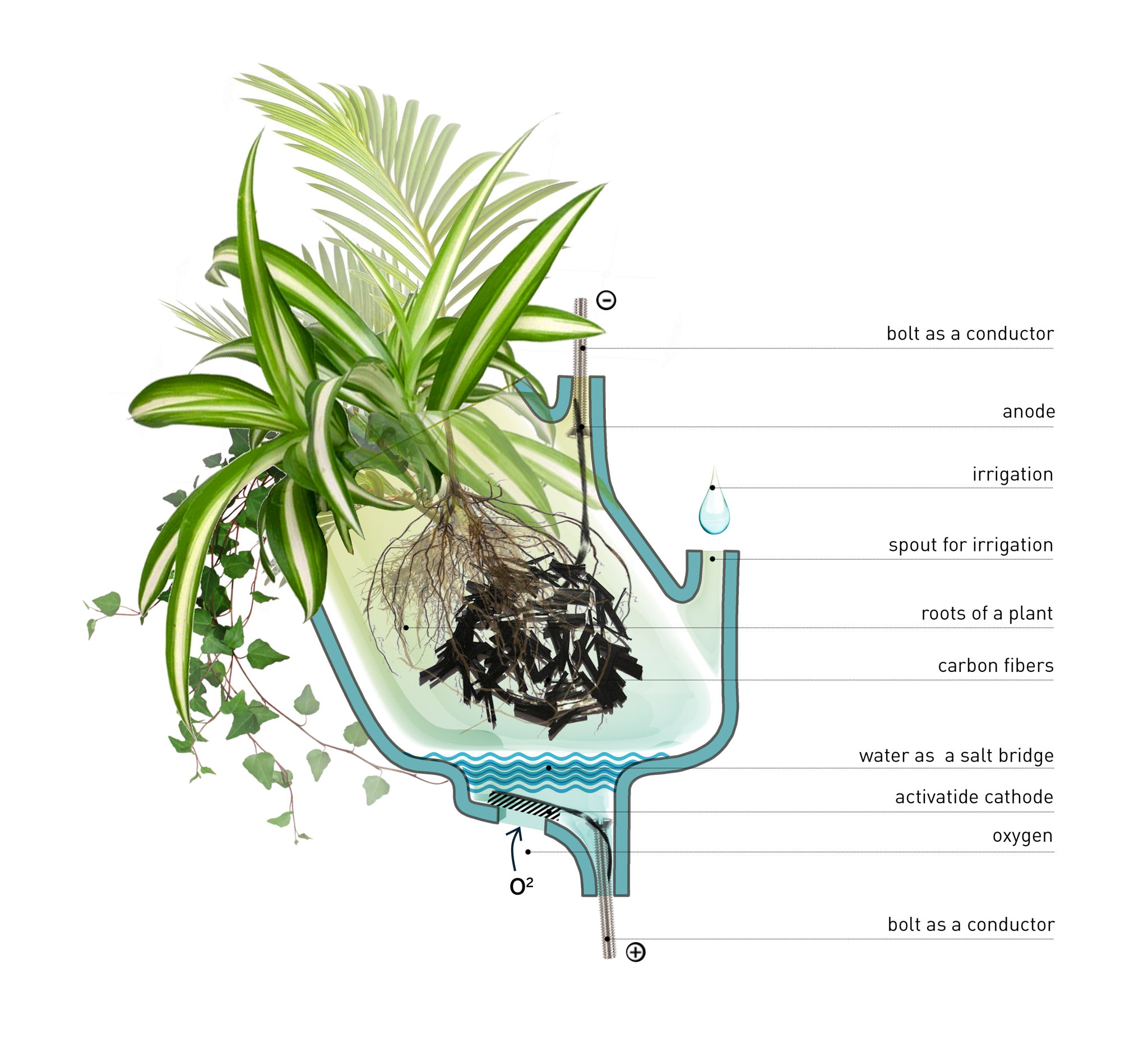 The installation Green Spark is a research multidiciplinary project that shows the cutting edge technology where plants are used to produce renewable energy which is urban-oriented. The system is represented by a set of batteries. Each one is a modular hanged ceramic pot that contains different species of plant with symbiotic bacteria. One battery can give up to 0,7 Volts. The current depends on the way the pots are connected (parallel or series circuit). The final installation contains 86 such batteries which allows to charge 2 smartphones simultaneously. The project goal is to test PMFCs through the integration to the city scale and urban infrastructure. The green batteries could represent a self-sufficient distributed system for the environmental eco-monitoring. It means that Green Spark produced energy is enough to charge the city sensors.