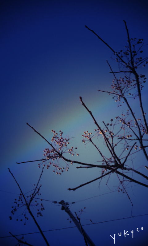 遠い空の木の実と虹のかかった紺碧の空のハーモニー