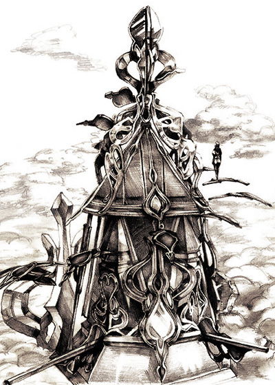 空の上の見張り台。飛行船がここから発着したりもする…というオリジナル設定で描きました。