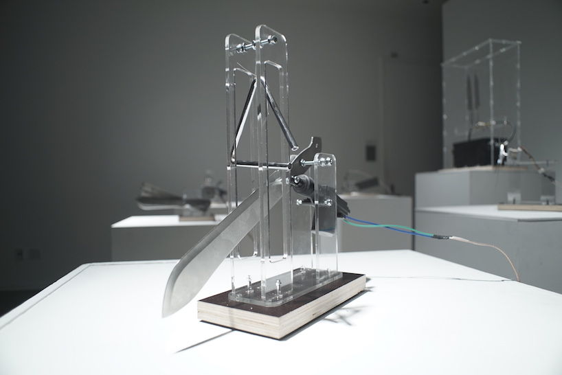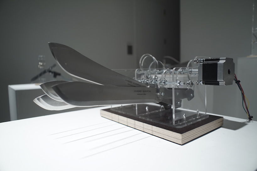 The Electric Knife Orchestra consists of sixteen knives and one meat cleaver (all purchased from the $0.99 store) that have been brought to life to perform the Bee Gees’ 1977 hit Stayin’ Alive. The orchestra consists of six musical machines and all of the sound is created through the operation of these machines.