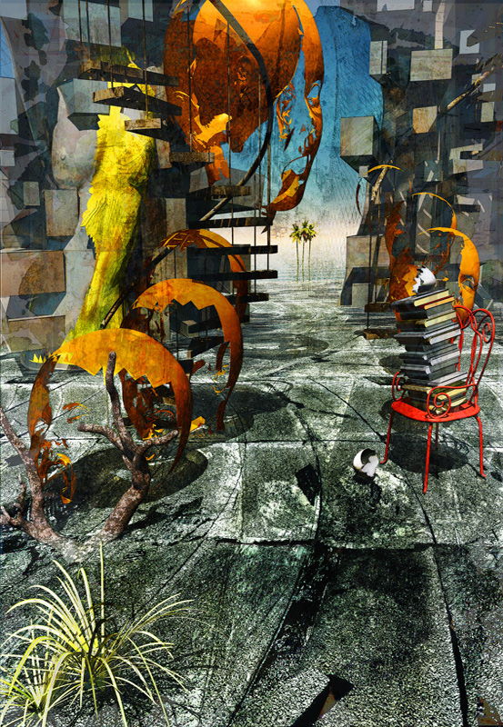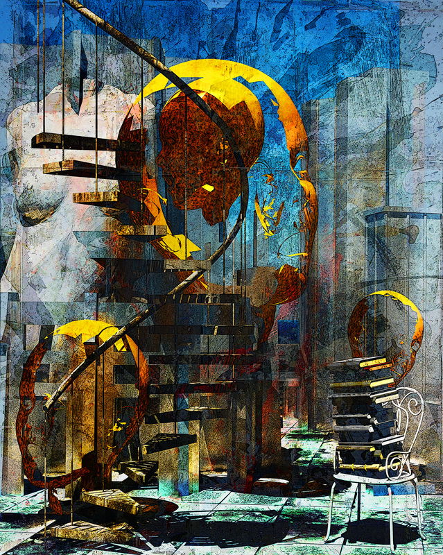 質感を工夫した岩の側面には、はるか上方を仰ぎ見る二つの顔がある。螺旋階段が明日につながり視線を導いてくれる。1匹の蝶が戯れる。そんな幻想の世界をイメージした。明るい未来につながる明日であってほしいと思う。