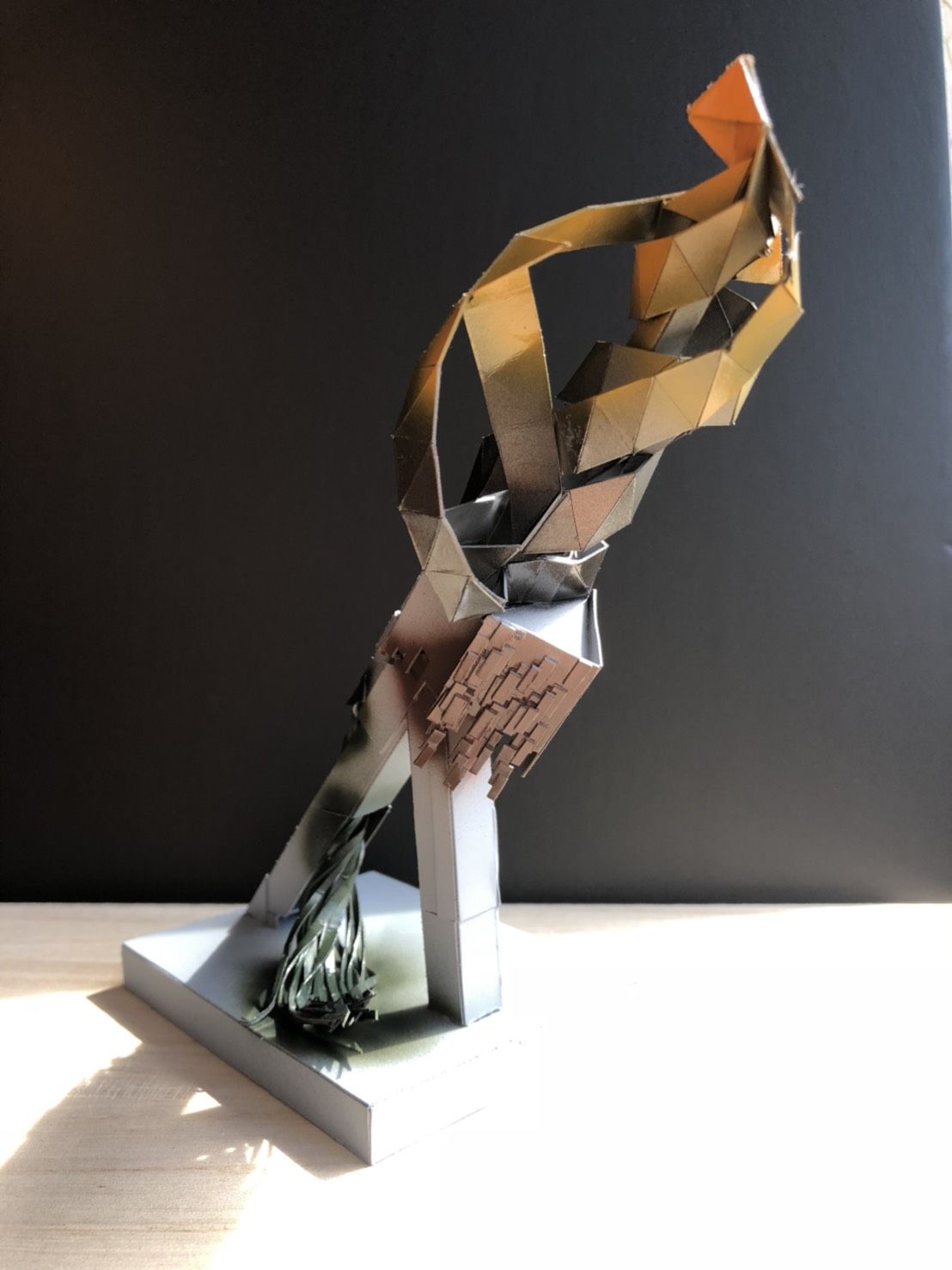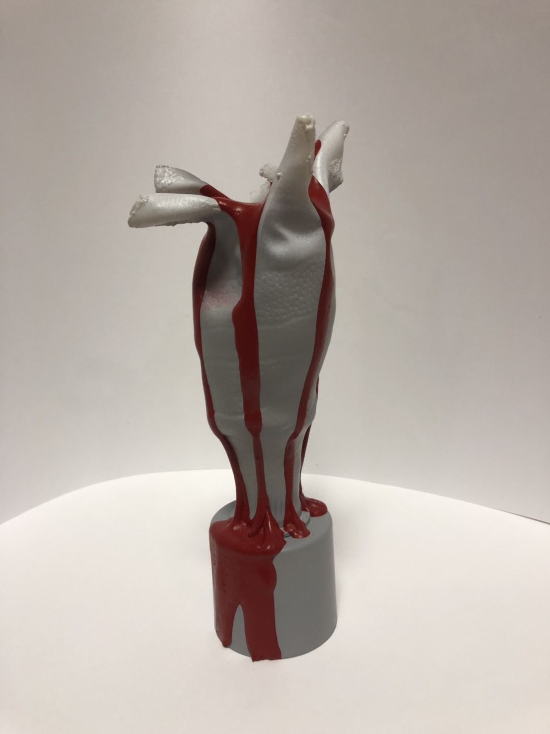 果物が破裂した瞬間を表現しました。容器が果物を、赤の部分が果汁を、容器の表面のザラザラが果物らしさを表しています。アピールポイント上に伸びる4つの突起から熟して破裂した果汁があふれている点、果物本体をグレーにし、果汁を赤を際立たせている点、あふれ方に動きがあり、果物に新鮮さを感じさせる点です。生命力があり、果汁があふれる果物です。