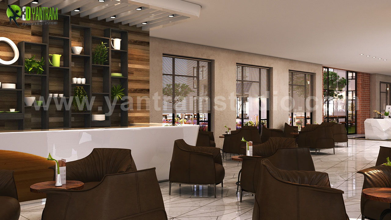 現代的な家具と座席空間を備えた3Dインテリアカフェ&レセプションデザイン - ベルリンのyantram建築デザインスタジオによるユニークなレセプションテーブルのアイデア