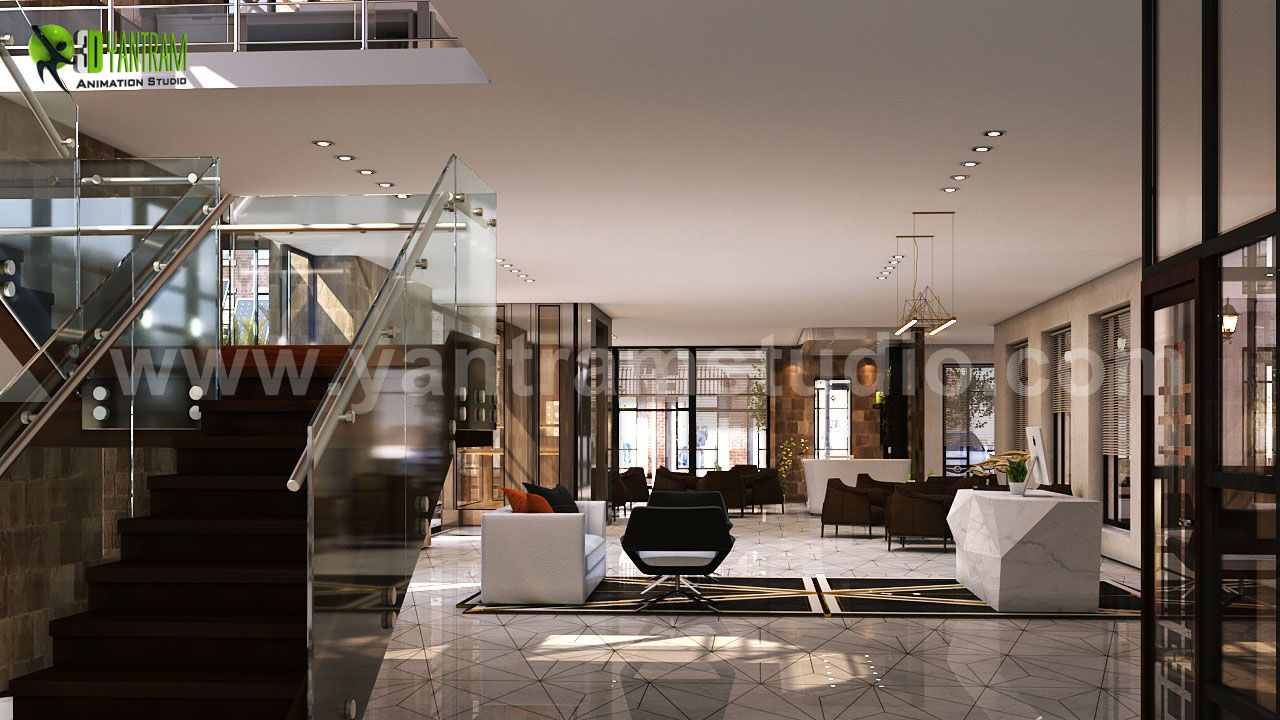 インテリアレセプションと3Dアニメーションスタジオによるラウンジコンセプト図面