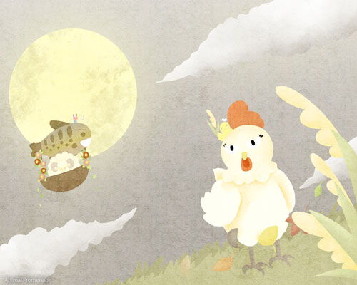 ニワトリのコケッコさんがみんなとお月見をしているイラストです。