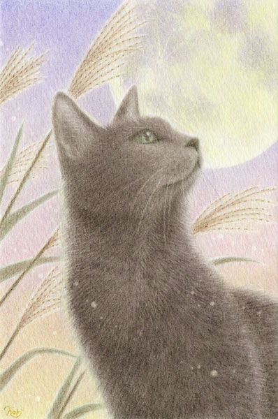 秋の七草より、尾花(ススキ)と空を見上げる猫。