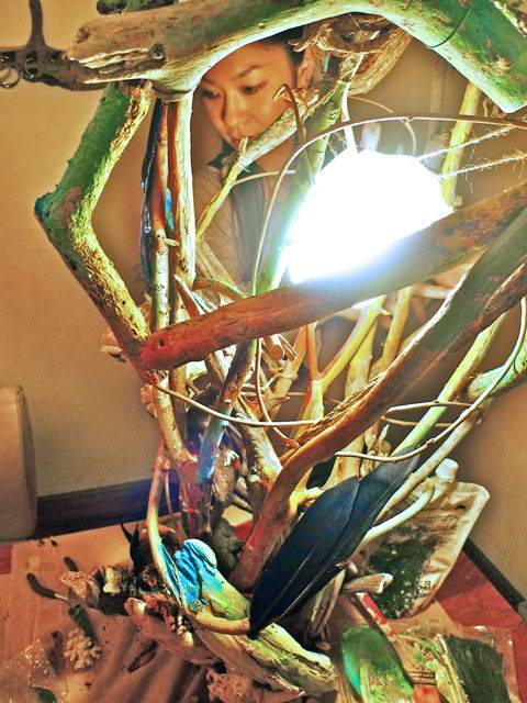 medialuna×げんめい展示の真ん中パーティにて、制作した livedeco ライブデコレーションです。 流木を組み立て、色を塗り、アクセサリーをデコレーションし、点灯しました。