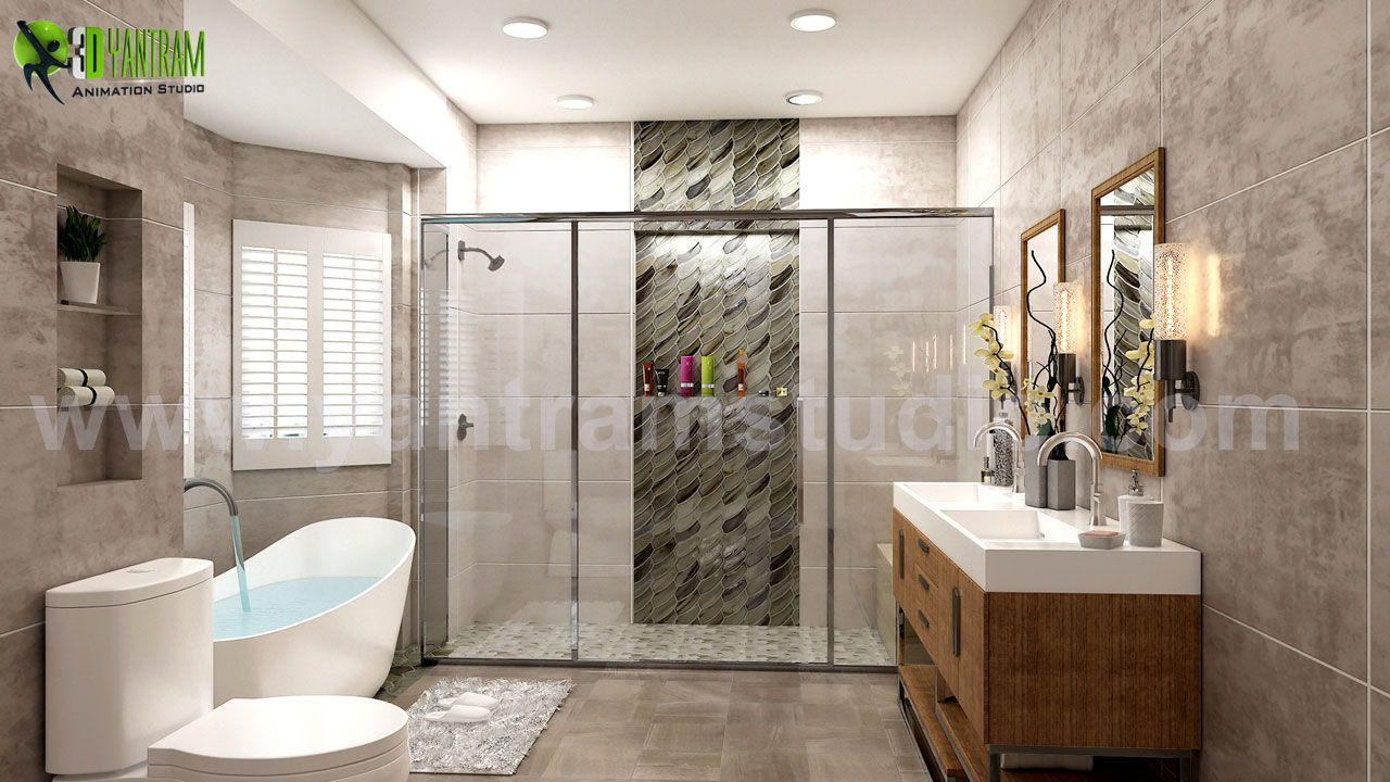 インテリアデザイン住宅のバスルーム - タップ、ミラー、引き出し、バスタブなど - 現代的な家具の感じで床タイルとシャワーの壁の素晴らしい色の組み合わせで設計 - yantram建築のアニメーション会社、ケープタウンのアイデア - 南アフリカ