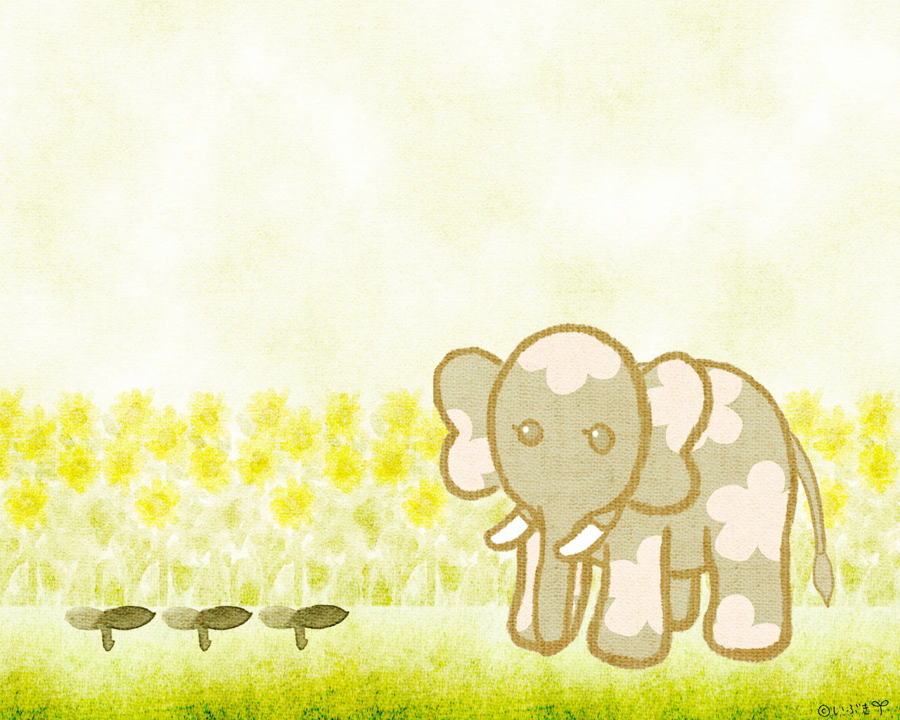 のんびり屋さんのひまわりさんと花柄ゾウさんの壁紙です。