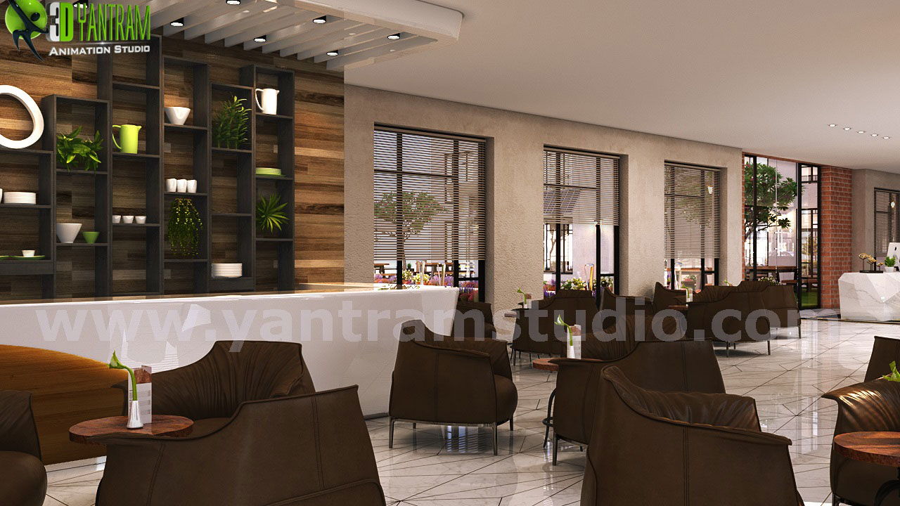 シッティング管理サービスを備えた3Dインテリアカフェテリアレンダリング