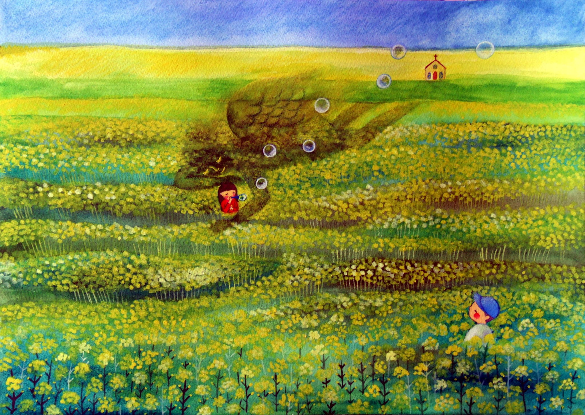 菜の花畑の雲の影は、天使の形になって、私たちをまもっている。