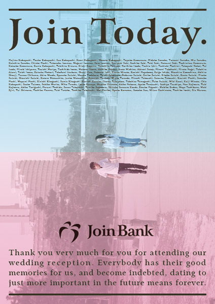 ブライダルツール/結婚する2人が銀行員なので、「Join Bank」という架空の銀行を設定し、その世界観を結婚披露宴に展開させました。/他の作品は下記サイトでもご覧になれます。 アトオシ atooshi http://www.atooshi.com/